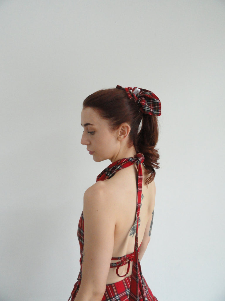 Draped Stewart tartan top with tie back and tie neck detail, made by hand in Scotland.