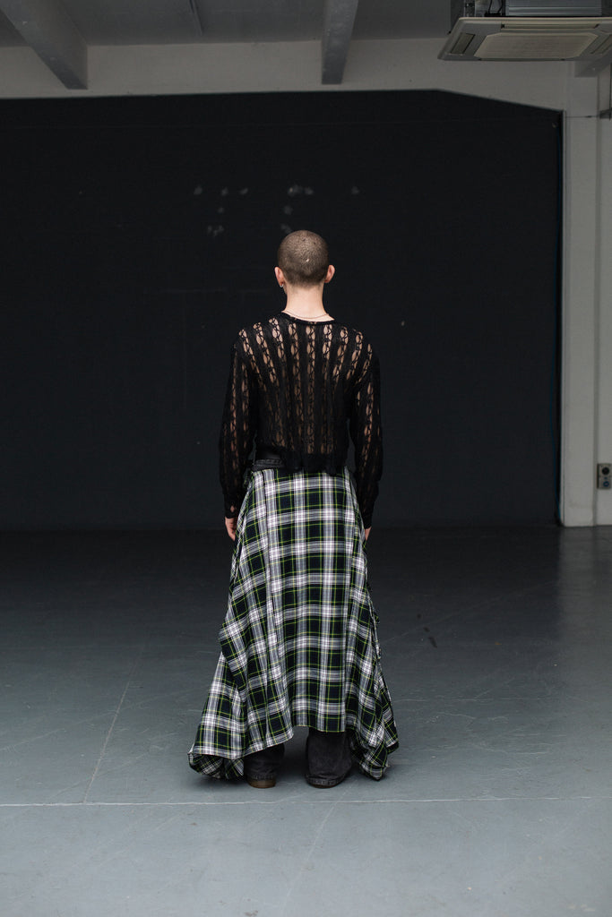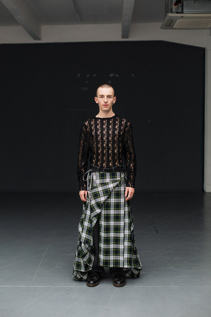 The men’s ‘Gordon Tartan Skirt’ is made from green and navy tartan fabric, featuring tie sides and wrap skirt tie closure (Kilt Pin not included) . Made by hand in Scotland.